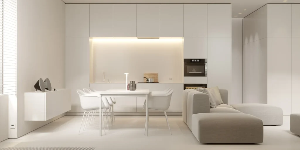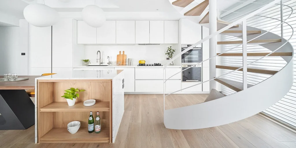The kitchen cabinets are predominantly light wood, paired with white wall cabinets, creating a clean and modern minimalist feel.